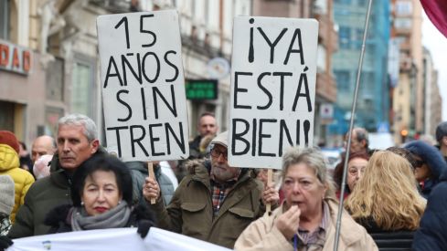 Sexto corte de tráfico en Padre Isla, a la altura de la estación de Matallana, para reclamar la culminación del proyecto de integración de la línea de Feve en su acceso al centro de León y rechazar la alternativa del autobús eléctrico que sigue proyectando el Gobierno de España y que implicaría la cobertura de los raíles de la plataforma tranviaria.
