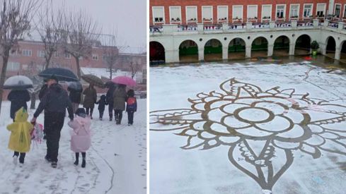 Eso sí, con muñecos de nieve, guerras de bolas y otros juegos propios de unas nevadas que cada son menos habituales en los inviernos. Por ejemplo, en el Colegio Marista San José de León se han entretenido sacando su vena artística para hacer dibujos con escobas en el patio.