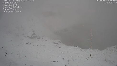 Las imágenes registradas por la webcam del refugio de Collado Jermoso muestran copos de nieve cayendo de forma constante y un paisaje invernal que empieza a teñirse de tonos fríos. Aunque las acumulaciones de nieve aún son ligeras, el cambio de aspecto es notable respecto a días anteriores, cuando el ambiente era más propio del verano.