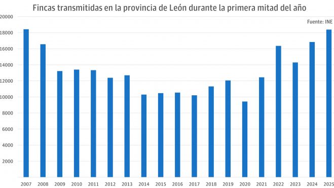 En concreto, a lo largo del primer semestre de 2025, el INE contabiliza en León más de 18.000 transmisiones de fincas. Concretamente, 18.385 operaciones que constituyen el dato más alto desde 2007, cuando se alcanzó un número prácticamente idéntico: 18.428, justo antes del estallido de la burbuja del mercado inmobiliario que sacudió la economía durante años.
