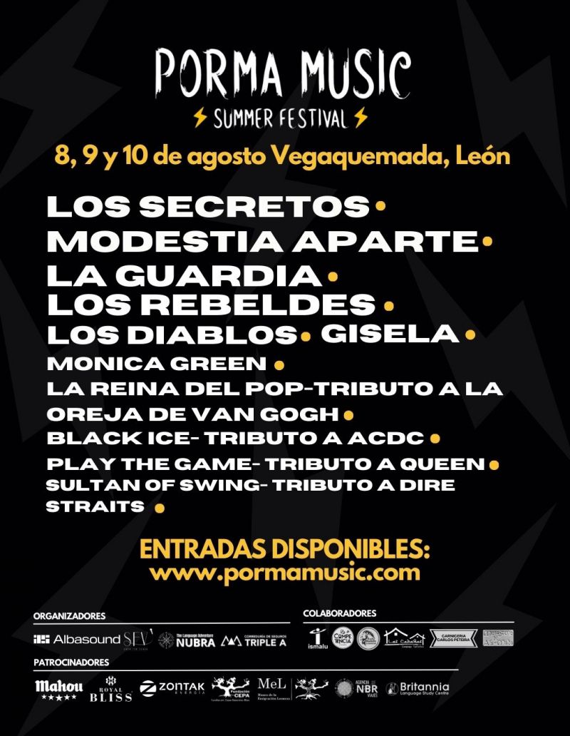 La Nueva Crónica sortea una entrada con acceso para los tres días para el Porma Music Summer Festival que se celebrará del viernes 8 al domingo 10 de agosto en Vegaquemada. El festival contará con grupos de la talla de Modestia Aparte, La Guardia y Los Rebeldes, con Los Secretos como cabeza de cartel.