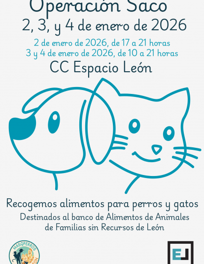 ‘Los Otros Vecinos-MasQPerros’ organiza una nueva edición de la Operación Saco, destinada a recoger alimentos para animales (gatos y perros). En esta ocasión, tendrá lugar los días 2, 3 y 4 de enero en el centro comercial Espacio León. El horario este viernes será de 17:00 a 21:00 horas, mientras que mañana y pasado se extiende de 10:00 a 21:00 horas. En estos primeros días de enero, se cumplen doce años de la puesta en marcha del Banco de Alimentos para Animales de Familias sin Recursos de León, y fue concretamente en el centro comercial Espacio León donde realizamos la primera Operación Saco. El objetivo de la Operación Saco es recoger donaciones en forma de alimentos para perros y gatos que serán destinados seguir ayudando a las familias beneficiarias del Banco de Alimentos para Animales de Familias sin Recursos de León que desde 2014 gestionan desde MásQPerros.