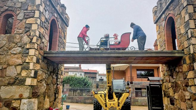 Está situación propicia imágenes muy curiosas. Una de ellas se vivía en la mañana de este sábado en Llama (Boñar), en las llamativas casas con torreón, muy partidarios de estas fiestas, en las que estaba ‘desembarcando’ en la pasarela de los torreones el mismísimo Papá Noel, pero no a lomos de su trineo sino de una espectacular Manitou que la subía con sus poderosos brazos.