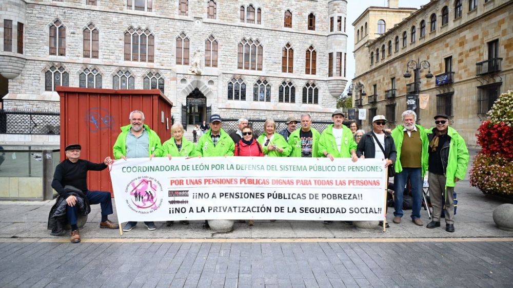 La Coordinadora de León por la Defensa del Sistema Público de Pensiones volvió a concentrarse este lunes al mediodía frente al edificio de Botines de la capital leonesa contra los efectos nocivos que conlleva la privatización de los servicios públicos del Estado del Bienestar.