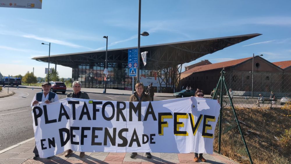 La Plataforma en Defensa de Feve se ha plantado este jueves en las inmediaciones del Palacio de Exposiciones para tratar de hacer llegar sus reivindicaciones al presidente del Gobierno, Pedro Sánchez, que ha participado en la clausura del Enise. Sin embargo, no se les ha permitido la entrada al recinto, por lo que han desplegado su pancarta en la glorieta de acceso para intentar que el presidente la viera. Cabe recordar que las reivindicaciones pasan por el regreso de los trenes de vía estrecha a la estación de Padre Isla y mejoras en el funcionamiento del servicio.