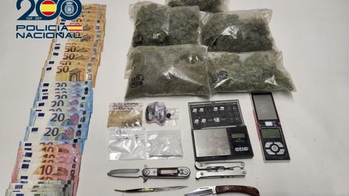 Durante el registro se incautó una cantidad significativa de sustancias y objetos relacionados con el tráfico de drogas: 20 gramos de cocaína, 4 gramos de heroína, 420 gramos de marihuana, 3 bellotas de hachís, 2 balanzas de precisión, 4 navajas y 950 euros en efectivo fraccionados en billetes de bajo importe.