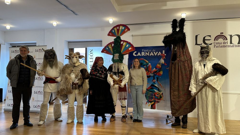 En la presentación del Carnaval de este jueves han estado presentes representantes de algunas de las localidades que el martes participarán en el desfile de los Antruejos de la provincia, una actividad que congregará en las calles de León a 400 participantes que exhibirán sus ancestrales mascaradas. En concreto este miércoles han participado en la rueda de prensa una pequeña representación de Tremor de Arriba, de Cimanes del Téjar y de Alija del Infantado. El próximo martes 13 de febrero se unirán a ellos de Riaño, Velilla de la Reina, Carrizo de la Ribera, Riello, Alcoba de la Ribera y Pozos de Cabreira. Este desfile partirá del Palacio de Exposiciones a las 19:00 horas. Ha sido Manuel Travieso quien en nombre de todos ellos ha agradecido la apuesta por la cultura leonesa con esta actividad y ha destacado de los Antruejos que “son herederos de rituales ancestrales”. En este mismo sentido se ha expresado Camino Orejas quien ha hecho hincapié en que “no podemos perder de vista que en la provincia de León contamos con una riqueza cultural inmensa en todo lo que se refiere a las mascaradas de invierno”.