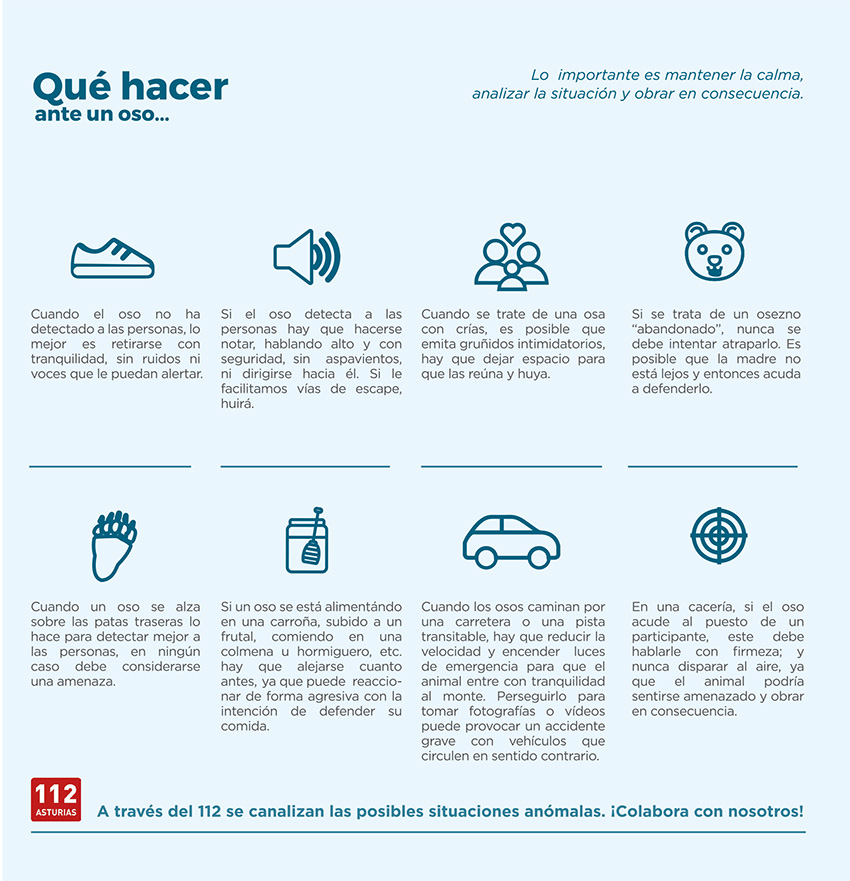 ¿Y qué hacer? Pues entre los consejos está el "retirarse con tranquilidad, sin ruidos ni voces que le puedan alertar" en el caso de que el oso no se haya percatado de la presencia del ser humano. Si por el contrario el oso ha vista a la persona lo que recomiendan es "hacerse notar, hablando alto y