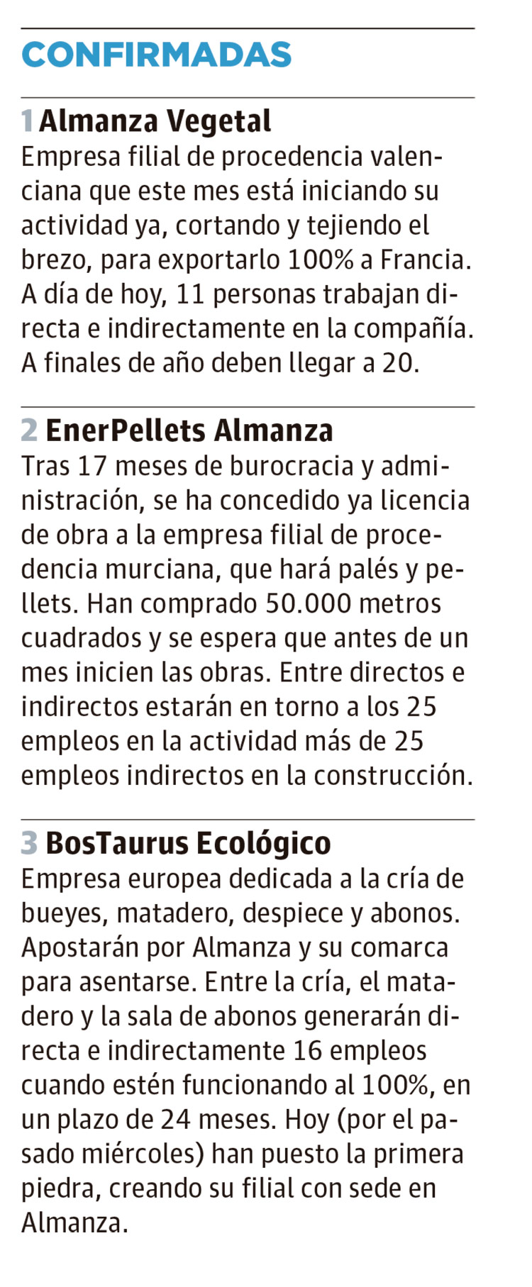 En el recinto del polígono se ubicarán una empresa que ya está trabajando en la zona, dedicada a la recolección y tratamiento de brezo para productos textiles. Una tercera empresa dedicada a la producción de insumos agrícolas también se asentará en el polígono. Además, según explica el alcalde, también hay varias peticiones de negocios y empresas locales para ocupar parte del espacio y que el polígono les sirva para crecer y aumentar su capacidad."Quiero que el polígono sirva de apoyo a las empresas de la zona para crecer"