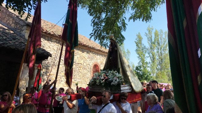 De manera paralela la imagen del Virgen salía desde la plaza de Robles en procesión, acompañada por pendones de la provincia y por la música de gaita y tambor a cargo del grupo ‘Bandina Tradicional Xácara’. Una vez en la ermita, tenía lugar la santa misa en el pequeño santuario mariano. En la campa, la actividad continuaba con el mercado, el pulpeiro, el servicio de bar, y la preparación del escabeche y la paella para la comida popular. Todo ello amenizado por la música popular de la banda berciana Aira Da Pedra.