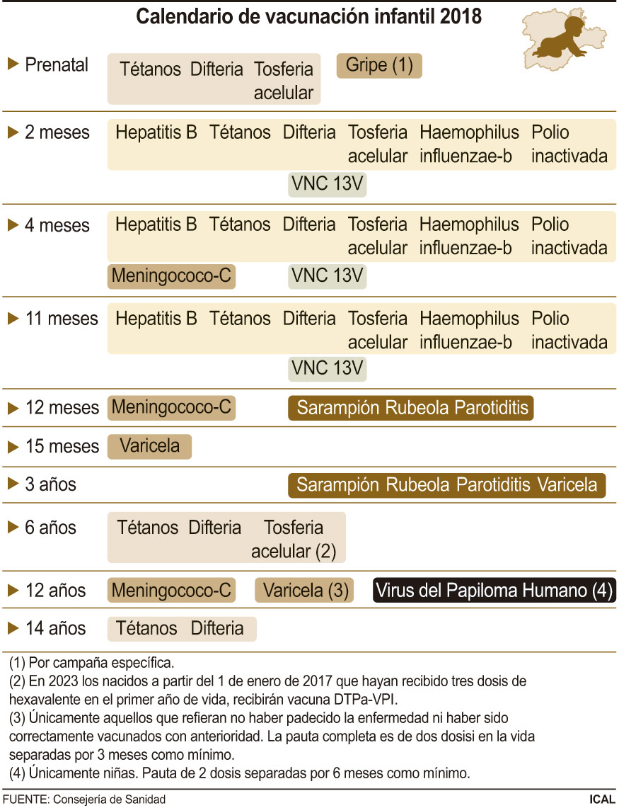 El resto del calendario se mantiene. Así, a los dos meses el calendario incluye la vacuna hexavalente que protege frente a la difteria, hepatitis B, tétanos, tos ferina, polio y haemophilus influenzae tipo b (Hib), cuya segunda y tercera dosis se administra a los cuatro y once meses. A estas edades también se incluye la del nuemococo, a la que se añade, a los cuatro meses, la del meningococo, que se repite a los doce meses. Al año de vida, los niños reciben la primera dosis de la tetravalente para prevenir el sarampión, la parotiditis y rubéola. En este caso, la segunda dosis se administra a los tres años. A los seis y 14 años se vacuna a los niños contra el tétanos y la difteria.