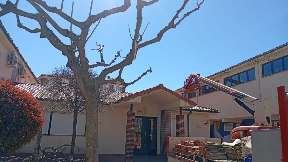 Asimismo, en el área correspondiente al colegio se está realizando un repaso del tejado, con la colocación de nuevas tejas en aquellas zonas donde se encontraban deterioradas. Debido a la complejidad de acceso, ha sido necesario el uso de grúa para garantizar la correcta ejecución de estos trabajos.