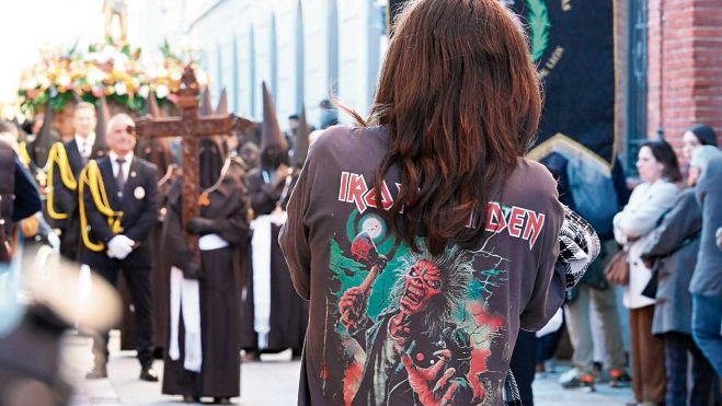 ¿No le falta exactamente un día a nuestro gran protagonista de la Semana Santa, de todas las semanas santas, para ser ajusticiado, cambiando la Cruz por la horca, que no se sabe muy bien cuál es la más cruel. Tal vez él/ella, el/la de la camiseta de Iron Maiden, tenga ahí más sentido que nadie