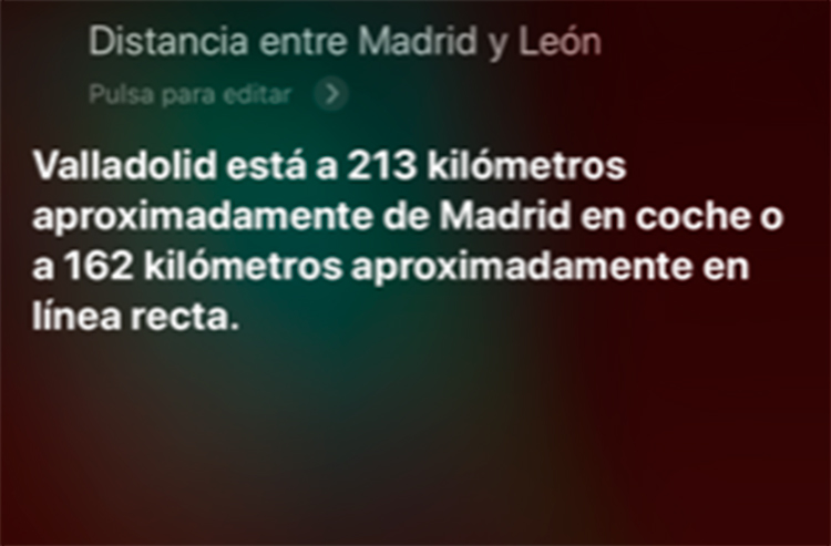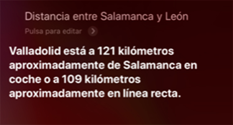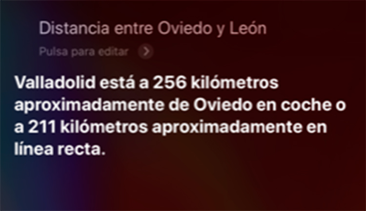 Esto es lo que responde Siri, la popular voz del asistente virtual los sistemas operativos IOS de los dispositivos Apple. Pero no es esta la única 'tara' de la voz 'inteligente' de la popular marca de la manzana. De este modo, y tal y como ha denunciado este lunes la Unión del Pueblo Leonés (UPL), se puede constatar como cuando se le pide la distancia entre León y cualquier otra provincia de España, el asistente contesta siempre dando como referencia Valladolid y no León, ciudad que para la aplicación no existe, como se puede contemplar en las imágenes adjuntas a esta noticia pues las referencias que facilita el sistema son siempre a la ciudad castellana, por lo que es fácil saber la distancia entre cualquier provincia y Valladolid, pero no la que existe con León.