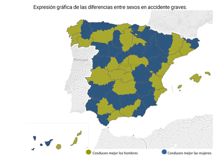 La «guerra de sexos» es, en buena medida, territorial. La mejora de las jóvenes conductoras respecto de los hombres es especialmente patente en algunos territorios: así, en general, en Galicia, en el litoral mediterráneo, en la capital y algunas provincias colindantes conducen mejor los hombres. Mientras, en Asturias, Aragón, gran parte de Castilla y León y Andalucía ganan las mujeres.