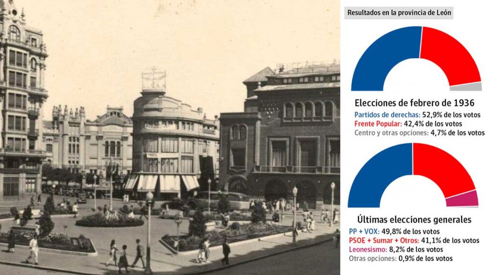 La derecha, ahora representada por PP y Vox, sumó en julio de 2023 un 49,8 por ciento de los votos en territorio leonés. Tres puntos de diferencia con respecto a 1936 que, teniendo en cuenta las encuestas que vaticinan una tendencia al alza de estas formaciones, bien podría alcanzar o incluso superar el 52,9 por ciento que las corrientes conservadoras obtuvieron en León hace 90 años.