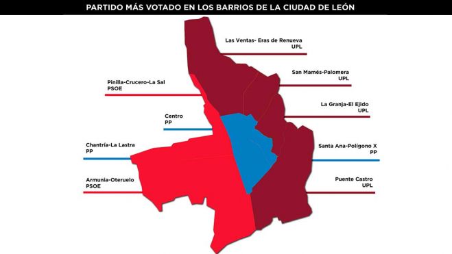 De este modo, UPL fue el partido más votado en cuatro distritos, en tantos como el PP. En Las Ventas, Eras de renueva, San Esteban, San Mamés, Palomera, San Lorenzo, Puente Castro, La Granja y El Ejido se registraron este domingo victorias leonesistas.