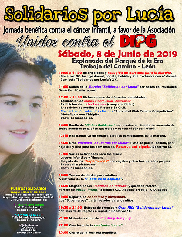 La actividad central de la jornada será la marcha ‘Solidarios por Lucía’ que recorrerá durante unos 40 minutos las calles de Trobajo del Camino y para la que se podrán adquirir dorsales solidarios a tres euros (que incluye bocata, bebida y rifa) y camisetas a dos euros. La marcha saldrá de la explanada del parque La Era a las 11:00 horas de la mañana y una hora antes los que quieran se podrán inscribir. Además, se ha abierto la inscripción anticipada que puede realizarse en el Ampa del Colegio Trepalio, en la peluquería Luna Imagen y en J. Carlos Joyeros.
