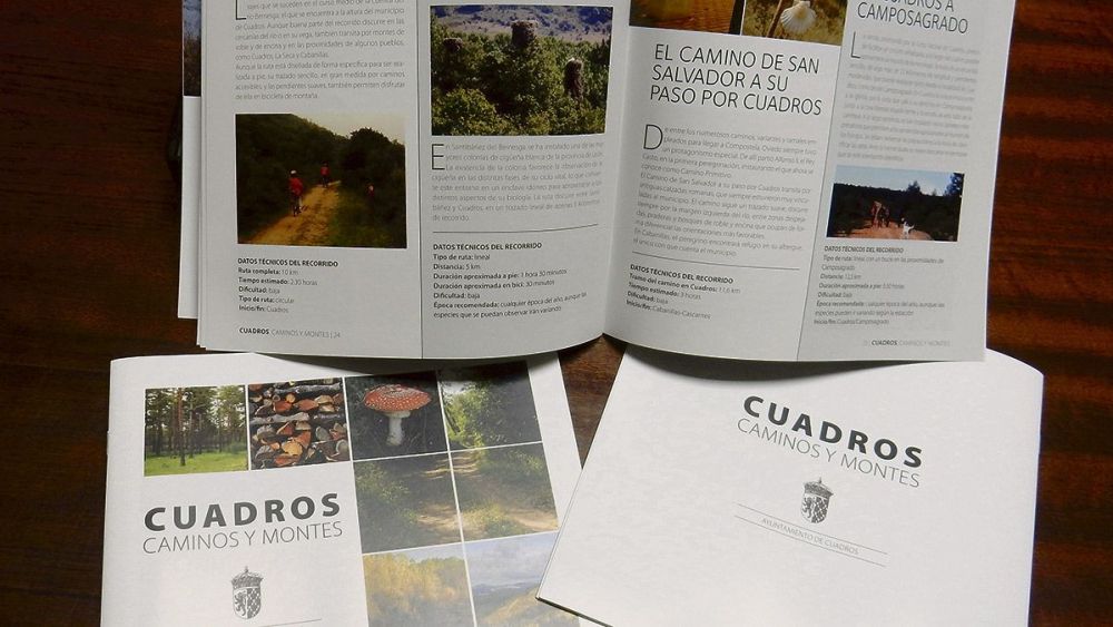 Bajo el nombre ‘Cuadros, caminos y montes’ esta guía es un trabajo que a lo largo de sus 32 páginas recoge el perfil general del municipio y va recorriendo cada una de las siete localidades que forman este municipio ubicado en la ribera del río Bernesga. No acaba ahí el trabajo que también se encarga de desgranar las virtudes paisajística que tiene el Ayuntamiento de Cuadros, desde el Bernesga hasta el pinar de Camposagrado, pasando por los robledales y los encinales, sin olvidarse de la riqueza de su fauna y de la riqueza micológica que tiene el municipio que también presume de contar con uno de los tramos más amplios de un Camino de Santiago tan peculiar como es el de San Salvador.