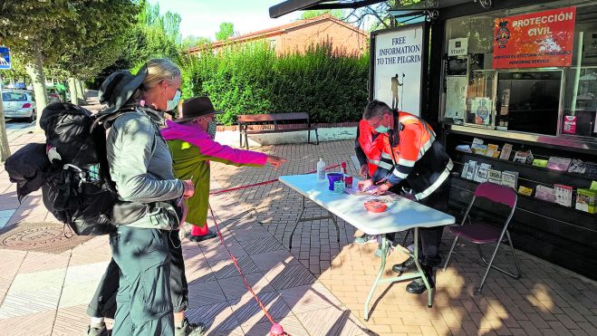 Este punto de información funciona desde las nueve de la mañana hasta la una de la tarde y se ubica concretamente en la avenida de San Froilán. Las patrullas jacobeas de Protección Civil, encargadas de dar información y asesoramiento a los peregrinos que realizan esta ruta, retomaron su actividad el pasado 1 de julio tras la paralización provocada por el coronavirus.