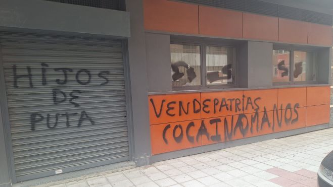 La sede del PSOE de León, en la callde 19 de octubre, ha amanecido este jueves con diferentes pintadas. Hijos de puta, vendepatrias, cocainómanos y puteros son algunas de las lindezas que los gamberros han escrito en la fachada.