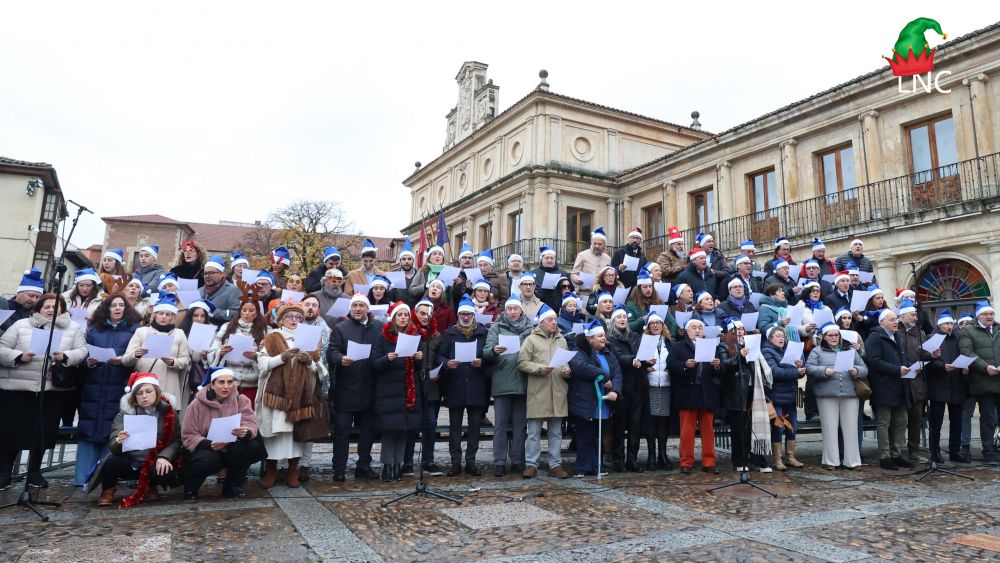 Este año, la grabación se llevó a cabo en la plaza de San Marcelo, donde se instalaron una gradas para que los ‘cantantes’ interpretaran la letra que, un año más, escribieron para la ocasión Javier Arias y Javier Baíllo, con guiños sobre los equipos locales, las tradiciones leonesas y, como no podía ser de otra manera, este año también con un recuerdo a quienes ayudaron este verano a evitar que ardieran más bosques en la provincia leonesa.