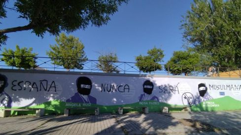 En esta ocasión, en el mural se puede leer la frase ‘España nunca será musulmana’ y las cabezas de sus protagonistas aparecen cubiertas con hiyab, el pañuelo que utilizan las mujeres que practican la religión islámica.