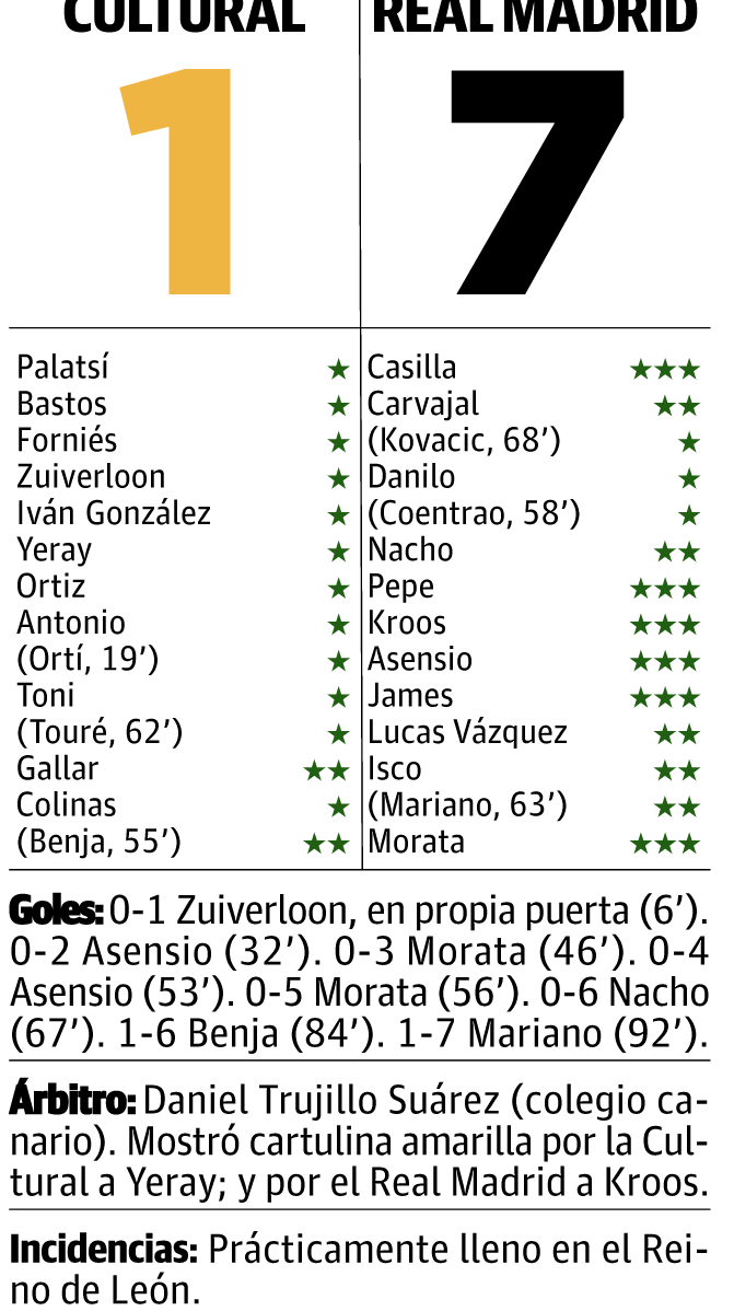 Los sueños, sueños son. Y los de la Cultural de pelear la eliminatoria al Real Madrid nunca llegaron a tener visos de realidad. Garra, ilusión y pelea no faltaron desde el minuto 1 hasta el 90. Pero también de principio a fin el conjunto madridista dejó claro que son dos equipos de galaxias tremendamente diferentes.Con un Kroos espectacular dominando a su antojo el centro del campo; un Asensio mágico y bigoleador situado en todas las zonas del campo e inventando y convirtiendo en petróleo cada balón que tocaba; un Pepe colosal para cortar desde el centro de la defensa cada intentona culturalista; y un Morata soberbio en el juego de espaldas y que encontraba dos veces el premio del gol; el Real Madrid pasaba por encima de una Cultural voluntariosa, que nunca renunció a su estilo de sacar jugado el balón desde atrás y que pudo haber marcado más goles de no haber sido por la falta de puntería en el remate final de un hiperactivo Gallar.