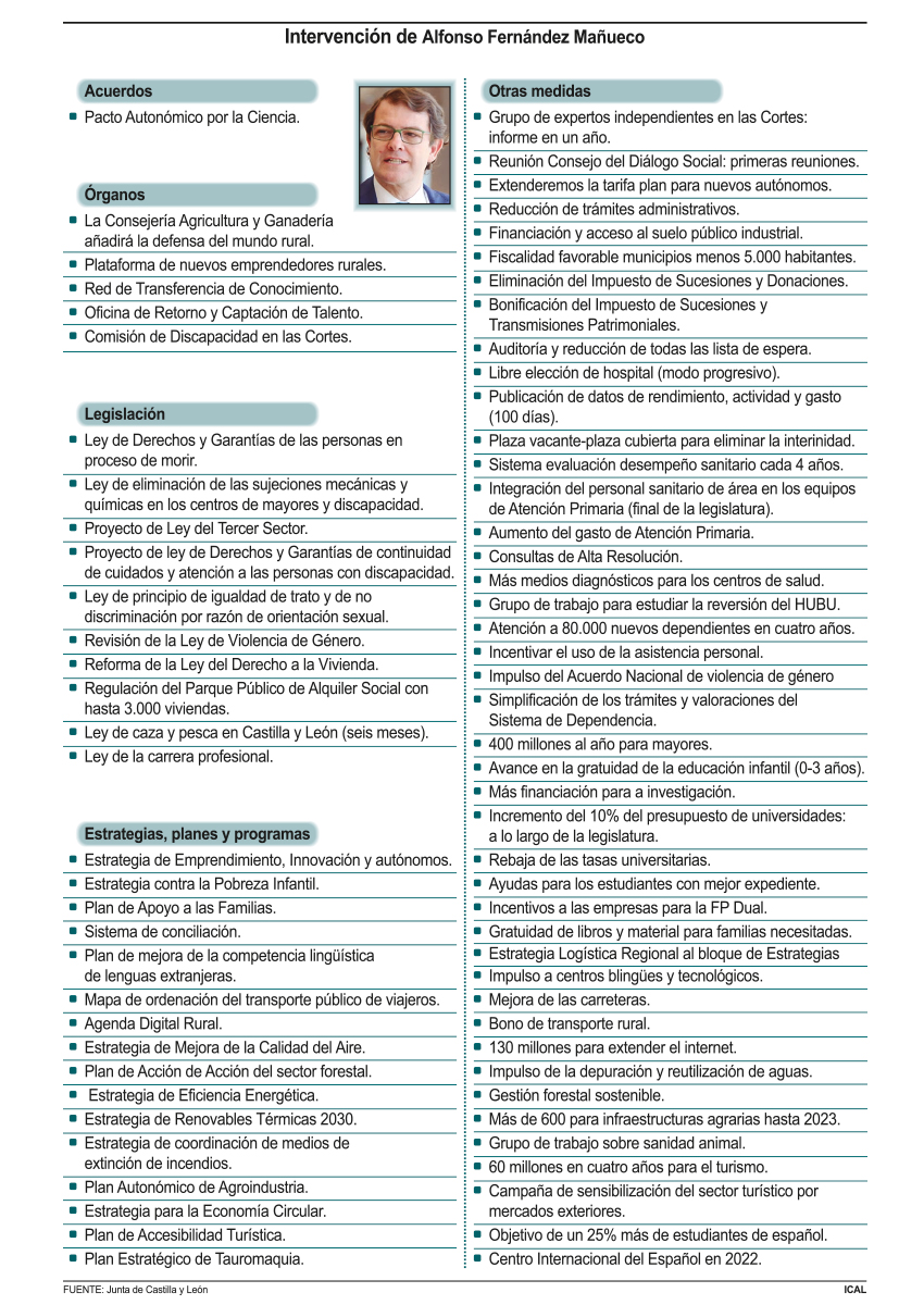 Fernández Mañueco insistió que el desarrollo rural, junto con la retención del talento y la promoción económica, constituye uno de los grandes retos que tiene por delante la comunidad y al citar los ejes de su plan de gobierno volvió a introducir la promoción de los pueblos junto con la lucha contra la despoblación, el crecimiento económico, el empleo, la calidad de lo servicios públicos y la regeneración.