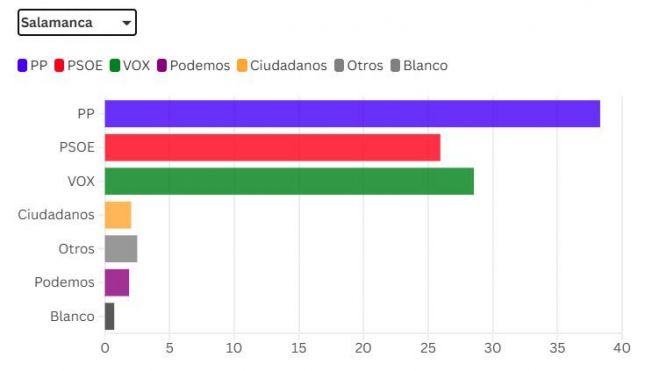 El reparto supondría una ligera variación respecto a la actual composición. El Partido Popular perdería uno de los cinco procuradores con los que cuenta en la actualidad, un escaño que pasaría a Vox, que reforzaría así su presencia en la circunscripción salmantina.