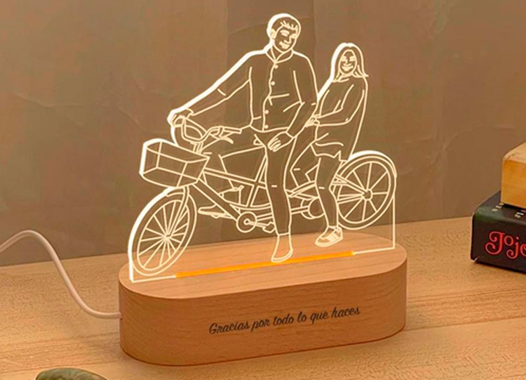 Lámpara 3D personalizadaEsta lámpara es ideal para iluminar la mesita de noche de la persona a la que le regales de una manera personalizada. Lo que tendrás que hacer es elegir una fotografía que os identifique y un equipo de diseñadores se encargará de ilustrar la imagen y hacerla en escultura.De esta manera, lo primero que verá esa persona al despertarse cada mañana será la figura que tú le has querido regalar.
