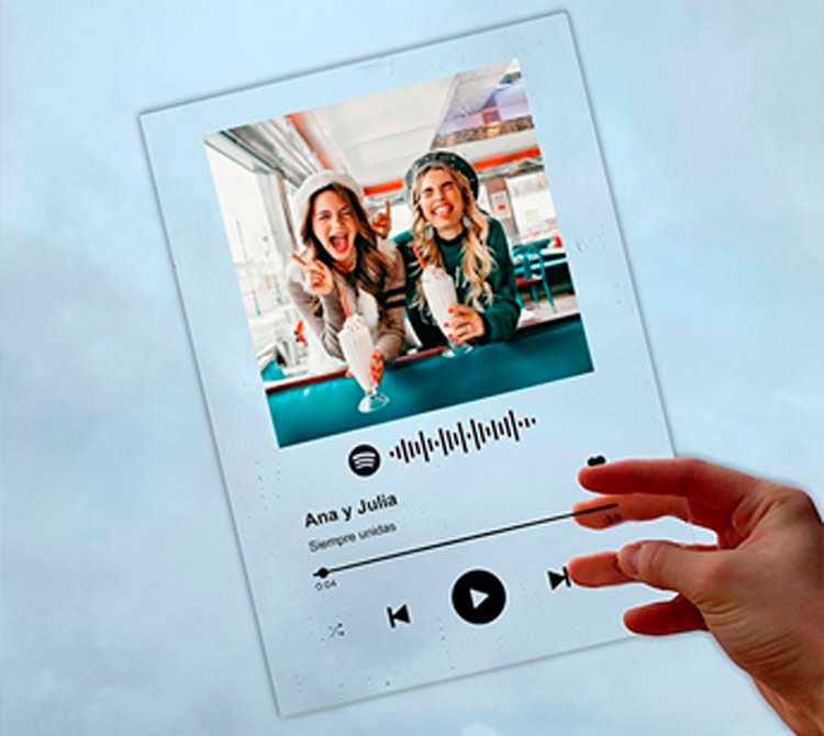 Placa Spotify personalizada La música es uno de los principales transmisores de emociones y seguro que cada canción te recuerda a un momento concreto y a una persona en particular. Con la placa Spotify personalizada podrás regalar vuestra canción especial a esa persona para que la reproduzca todas las veces que quiera.Cada canción en Spotify funciona con un código único, por lo tanto, simplemente necesitará escanear el código de la placa decorativa que tú le regales, para que la canción comience a sonar.Podrás elegir el tamaño de la placa, la fotografía que quieres que se vea en la portada, la canción que sonará y si quieres algún complemento extra como un marco, una base con luz, etc.