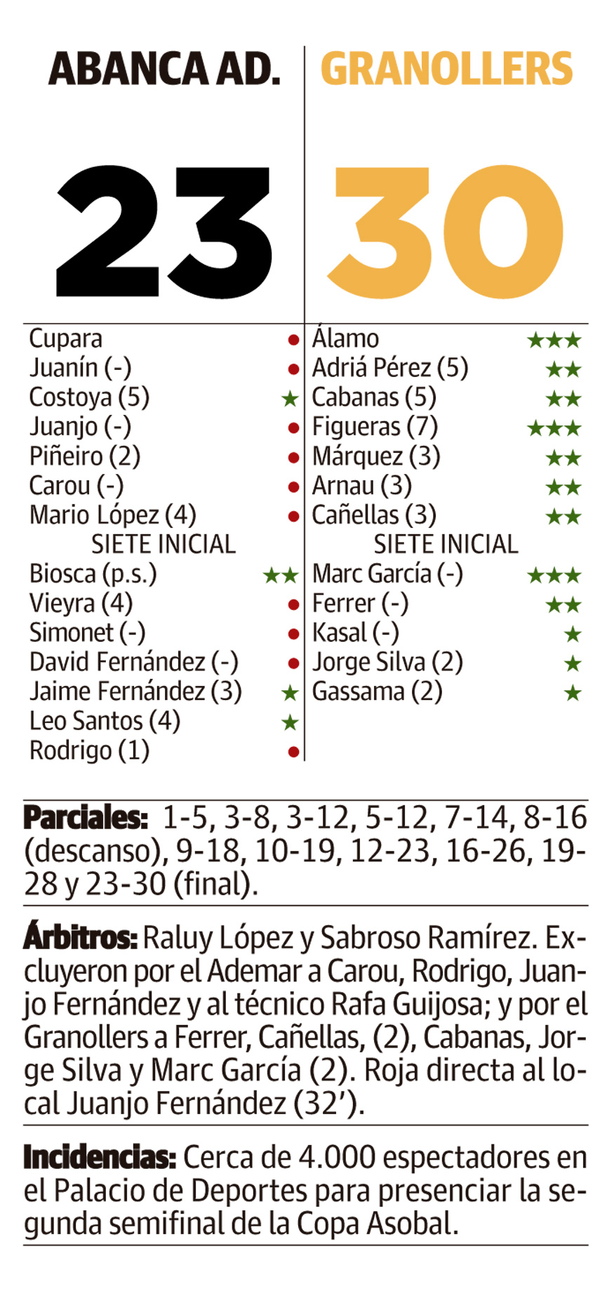 Otra vez con la cabeza gacha. De nuevo, por tercer año consecutivo, León no es talismán para un Abanca Ademar que se vuelve a quedar fuera de la final de su Copa Asobal. Aunque esta vez, la derrota es más dolorosa que nunca. El año en el que mejor llegaban los leoneses, en el que más posibilidades reales se veían de que tanto tiempo después pudieran optar a ganar un título, llegó el mazazo gigante. Máxima decepción sin ninguna opción, porque los de Rafa Guijosa fueron barridos de la pista por el BM Granollers, que se impuso por 23-30 en un choque que dominaron de principio a fin.Atenazados por la presión de ser favoritos y comenzar a remolque, tremendamente desacertados en el lanzamiento y con multitud de errores defensivos, los leoneses mostraron su peor cara de toda la temporada en uno de los días más señalados de la misma, provocando la tremenda desilusión de un Palacio que vistió sus mejores galas y se volcó con su equipo pese al resultado adverso, pero vio cómo el choque estaba ya muerto a muchos minutos para la conclusión.