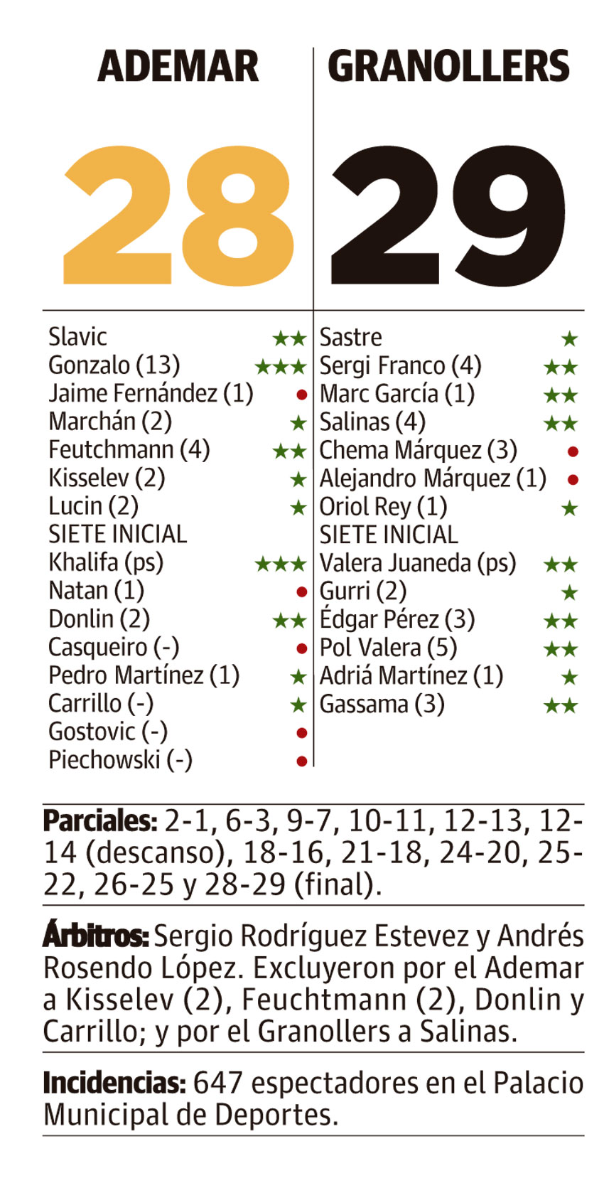 Gassama metió el gol del triunfo a 40 segundos y Jaime se precipitó con un tiro lejano a falta de 9 La iniciativa era del Ademar, más aún cuando a falta de minuto y medio Jaime forzaba un penalti, pero la perdía cuando Feuchtmann no lograba superar a Varela, que detenía el balón. Y Gassama, letal en el tramo final y cada vez más reconvertido de extremo a lateral, se levantaba desde lejos para poner el 28-29 con 40 segundos por delante.