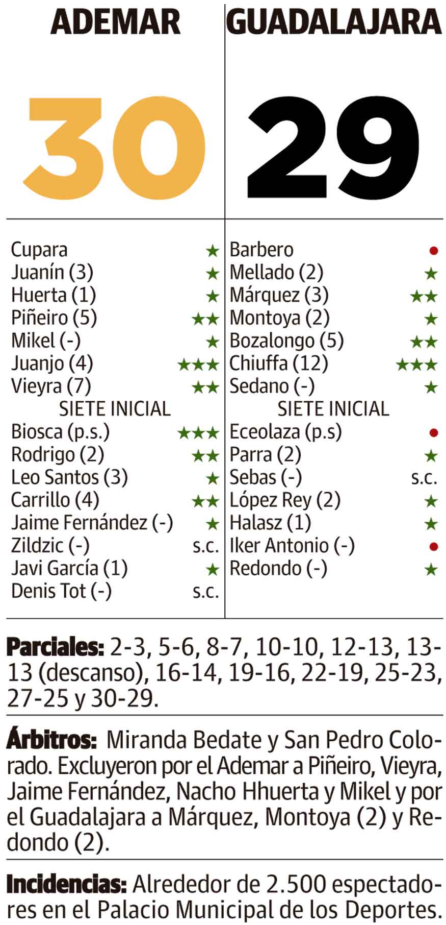 El Abanca Ademar continúa sin explotar tras el parón del Europeo y a pesar de no mostrar su mejor versión fue capaz de vencer ayer ante su afición al Balonmano Guadalajara por la mínima (30-29) y con mucho sufrimiento.No pudo respirar tranquilo hasta la bocina final el público leonés que acudió con ganas al Palacio tras casi dos meses sin balonmano oficial, y es que los alcarreños tuvieron la última bola del partido para empatar aunque eso sí, con solo tres segundos por jugarse. Un encuentro igualado que solo la garra y el coraje mostrado por el equipo y en particular por Juanjo Fernández y Rodrigo Pérez terminó decantando la victoria para los locales.
