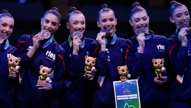 Las gimnastas leonesas del Club Ritmo, Andrea Fernández y Andrea Corral, festejaron la medalla de bronce con el conjunto español en el Campeonato del Mundo que se disputa en Río de Janeiro y se ganaron el derecho a pelear por los títulos de las finales de cinco cintas y el mixto.