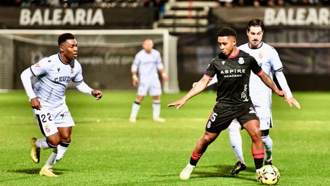 Lucas Ribeiro encara a dos defensores delCeuta durante el encuentro.  LALIGA