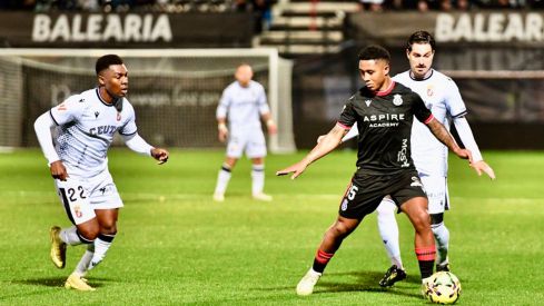 Lucas Ribeiro encara a dos defensores delCeuta durante el encuentro. LALIGA