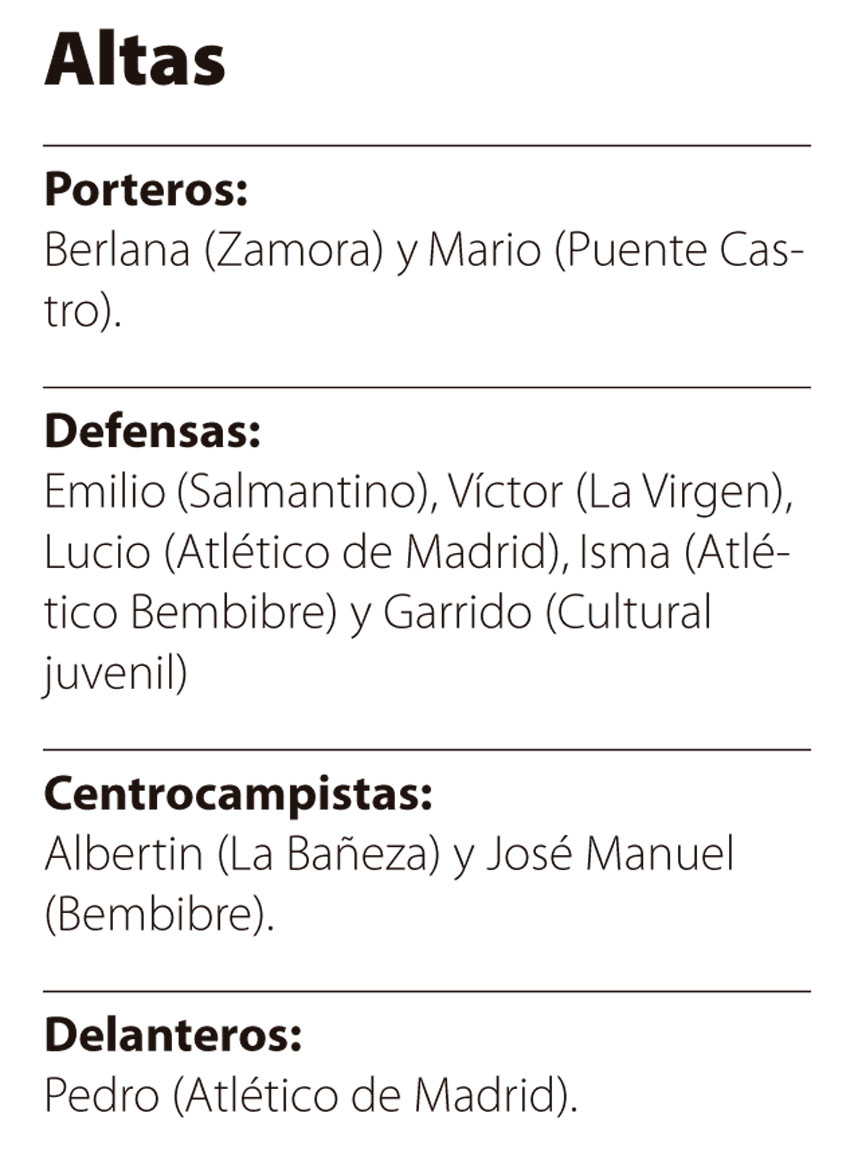 ¿El resto de refuerzos? Están liderados por el guardameta Berlana, llamado a defender una portería que compartirá con el joven llegado del Puente Castro Mario. No es el único juvenil que llega al Astorga, que también ‘pescó’ en la Cultural al central Garrido, así como en otros equipos de la provincia con la llegada del interior izquierdo Albertín, una de las claves del buen año pasado de La Bañeza, y del mediapunta del Bembibre José Manuel. Más exóticos son sus otros dos refuerzos, los jóvenes chinos cedidos por el Atlético de Madrid Zhou Xiao (conocido como Lucio y que es central) y Liang Huang (de sobrenombre Pedro y que actúa como punta).Una plantilla conformada por el mítico ex culturalista Juan Bardal, nuevo secretario técnico, que tendrá todavía más refuerzos pero con la que el técnico Miñambres se muestra ambicioso y deja claro que «el objetivo con el que parte el proyecto es meternos en ese ‘playoff’ e intentar hacerlo desde el principio».