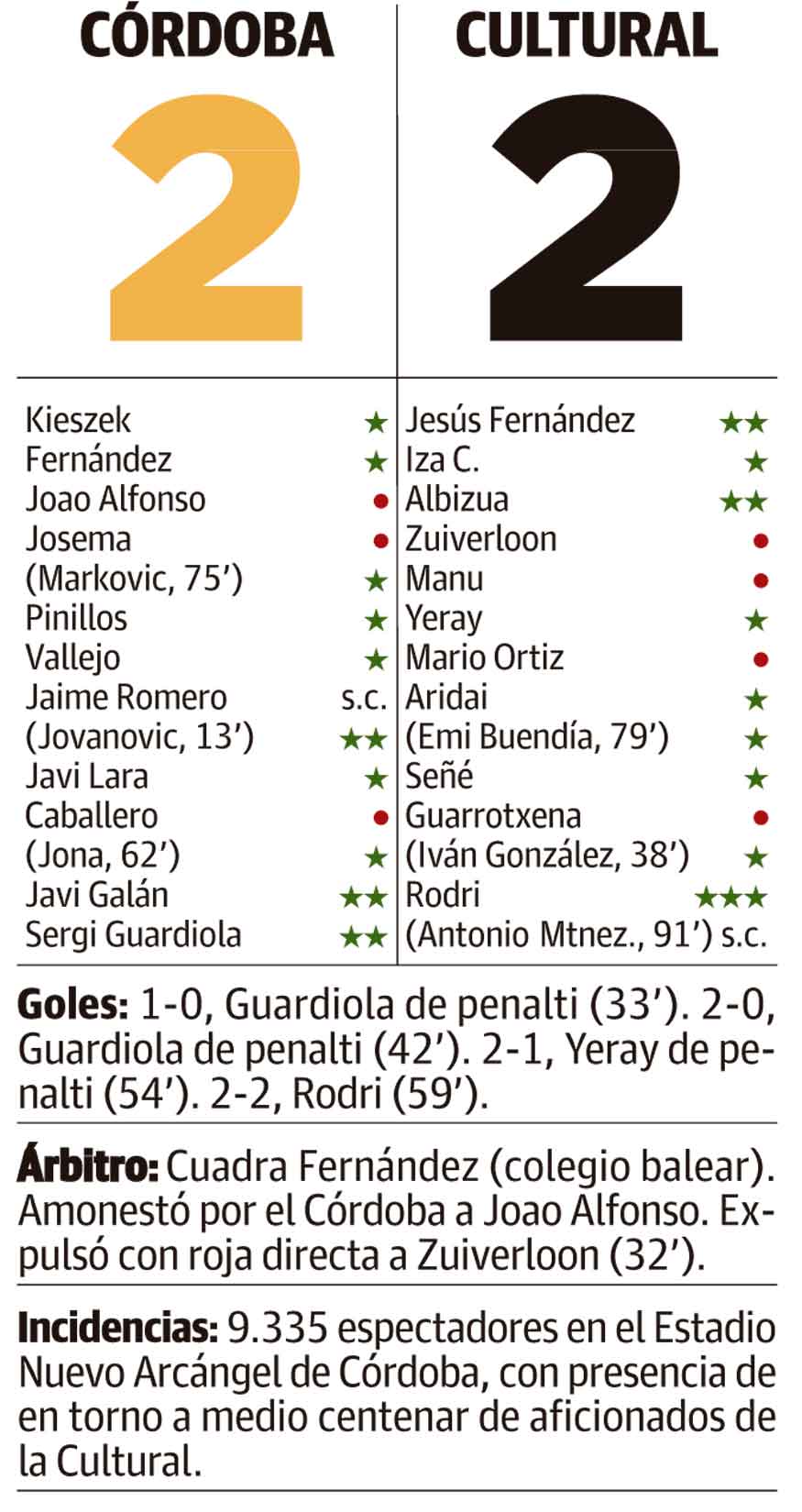 Se igualaron las fuerzas por momentos, lo que tardó en cumplirse la media hora de partido y que tuviera lugar la acción que terminaría marcando el devenir del mismo. Un error en la salida del balón leonés permitía que el Córdoba encontrara en largo a Jovanovic tras ganarle éste la espalda a Manu para que el serbio ganase la línea de fondo y pusiera un centro al corazón del área. Allí entraba con todo Sergi Guardiola, que terminaba en el suelo tras ser agarrado por Zuiverloon. Sin dudarlo, Cuadra Fernández decretaba la pena máxima y enseñaba la roja directa al holandés. El propio Guardiola no fallaba desde los once metros a pesar de la buena estirada de Jesús Fernández y ponía el partido en contra para la Cultural.