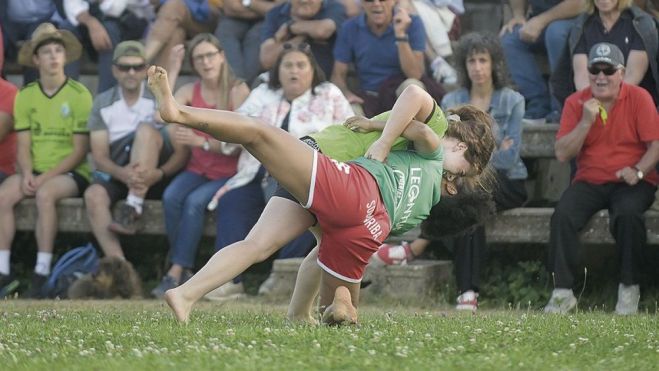 Frente a ella su prima María Cadenas, que dejó muestras de que tampoco lo suyo es la aparente fragilidad en el reciente Europeo de Luchas Celtas, con dos medallas. Se agarraron con ganas, se impuso la veteranía y, sobre todo la buena lucha de La niña, que salía abrazada a María.