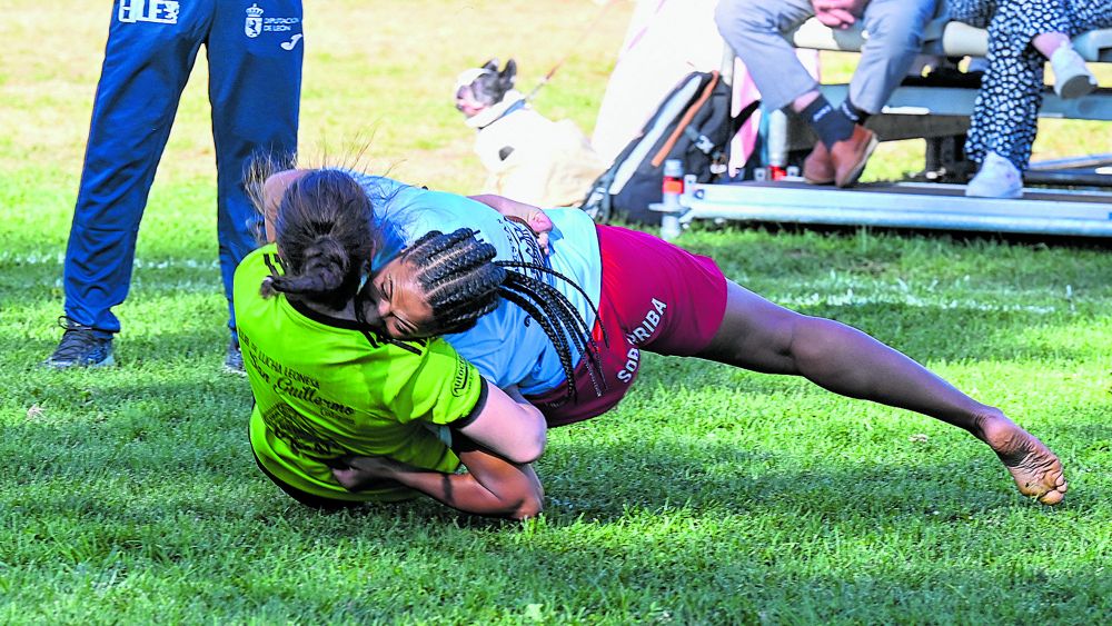 En pesados sí estaba la líder, Edi La Gemela (también estaba Paula para comprobar la igualdad pero Pau no luchó) e hizo valer su presencia en uno de esos corros a los que nos tiene acostumbrados, de victoria agónica. Primero sufrió mucho con la juvenil Paola, que se le adelantó con una entera de raza y después le aguantó los embites prácticamente hasta el final, cuando le dio una media definitiva casi sobre la bocina. Ganó después con más solvencia a Lucía la de Prioro y en la final la esperaba la ganadora de Villanueva, La Nómada de Rivas Vaciamadrid, María Cabas, que es la ‘antítesis’ de Edi: tiene más cuerpo, mucha tranquilidad que viene de practicar diversas artes y ser experta en defensa personal y tener muy claro qué hacer. Enfrente Edi, con una arma única, la lucha leonesa, sus mañas y sus falseos... Se adelantó María, y se repuso Edi pero la última caída, con La Gemela en el suelo de rodillas y la madrileña tratando de llevarla por inercia fue la demostración de la diferencia de armas. Ganó la lucha con Edi mareada, su hermano Chelo llevándole chuches y Lucía Cuesta chocolate para que se repusiera, por si era cosa del azúcar.