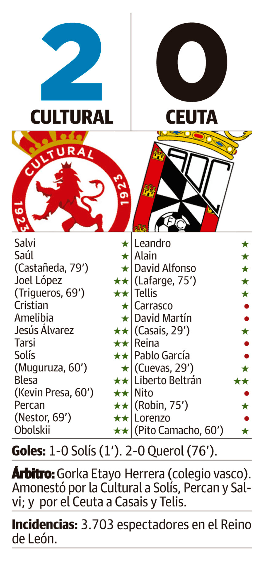Cuando vienes de perder ante tu público el primer partido y el segundo vuelve a ser en casa y ante un recién ascendido, uno de tus peores enemigos puede ser la ansiedad. Sin embargo, la Cultural derrotó a ese posible enemigo a las primeras de cambio, adelantándose con uno de los goles más rápidos de su historia para olvidar los nervios que pudieran aparecer en campo y grada, y encarrilando el que acabaría siendo su primer triunfo liguero tras imponerse 2-0 al Ceuta.Cumplieron los leoneses en un partido que por momentos llegó a parecer que se decidiría por aplastamiento, pues tras el tempranero 1-0 de Solís los primeros 30 minutos la Cultural tuvo metido en su área al Ceuta y creó ocasiones de sobra para haberle dado la puntilla. Después tuvo un tramo en el arranque de la segunda mitad de sufrimiento y dudas defensivas donde sólo la falta de puntería de los visitantes impidió que llegara el empate; y por último dejo un cuarto de hora final de tranquilidad desde que en un rechace Querol lograra ampliar la ventaja.
