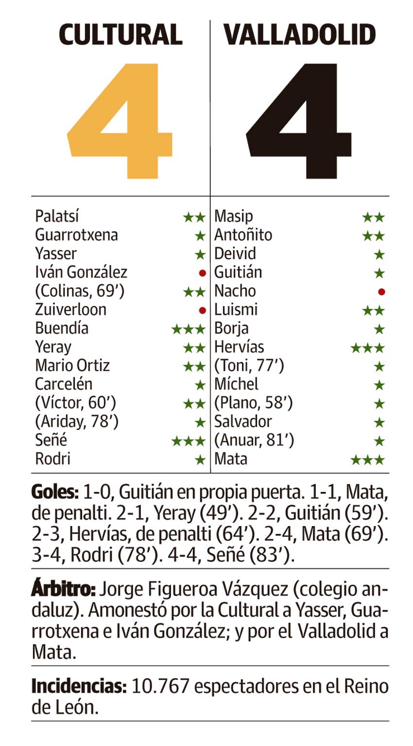 El árbitro se inventaba un penalti a Señé, que Rodri fallaba con 1-0, y otro a Matas con el que Hervías hizo el 2-3 Salieron los leoneses con sólo tres defensas, pues los carrileros eran dos hombres tremendamente ofensivos como Guarrotxena y Buendía. Yendo a por el partido con descaro ante un candidato al ascenso como es el Valladolid. Sin cambiar de esquema ni echarse atrás pese a ponerse por delante. Tocando y tocando. Mandando. Pero también peleando y sabiendo sufrir. Porque, si algo ha demostrado el equipo leonés, es que nunca deja de creer. No lo hizo cuando se vio dos goles abajo a poco más de un cuarto de hora para el final. Mantuvo la fe, la garra, la ambición y el coraje, y acabó logrando la igualada. Y donde otros se hubieran conformado, siguió yendo a por los tres puntos, provocando que a punto estuviera de quedarse sin ninguno de no haber aparecido un salvador Palatsí para sacarle un mano a mano a Matas en el descuento. Son las luces y las sombras de una idea poco habitual hoy por hoy en el mundo del fútbol. Un oasis para los románticos del juego ofensivo y de ataque. Una bendita locura llamada Cultural.