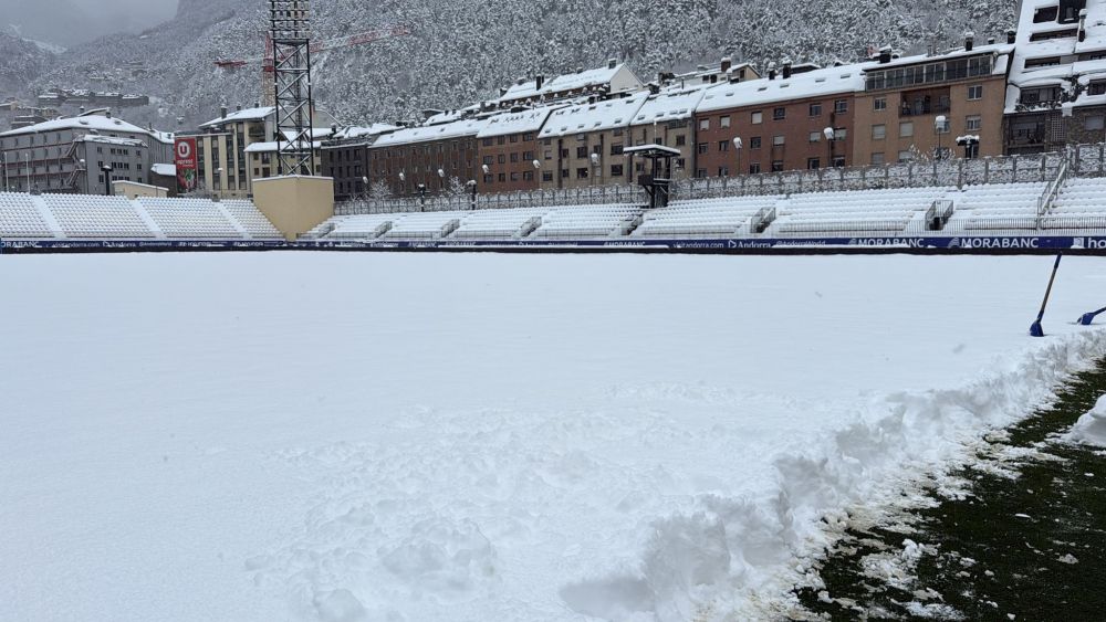 De hecho el Andorra ha pedido a sus aficionados, mediante un vídeo de Gerard Piqué pala en mano entre la nieve, que acudan con más palas y material a retirar la nieve del campo, para ver si puede estar a tiempo con la intención de que se dispite este sábado.