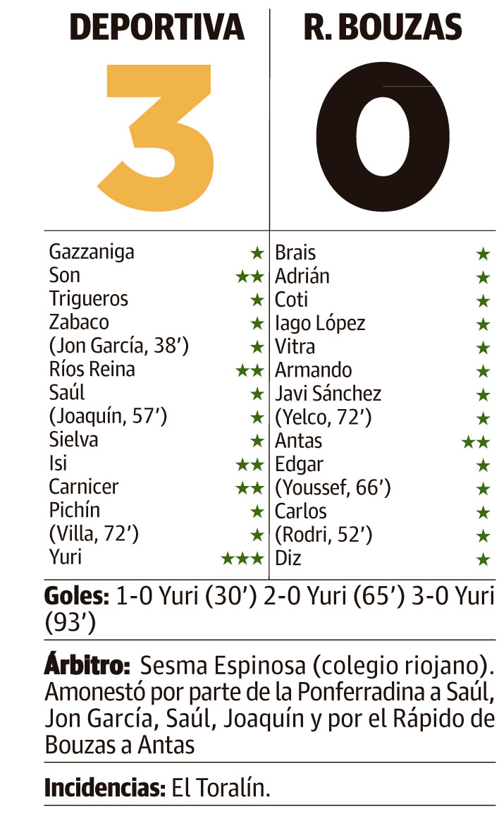 Que pase el siguiente. La Deportiva logró su quinta victoria consecutiva ante el Rápido de Bouzas (2-0), mucho más equipo de lo que dice la tabla, y sigue dejando víctimas en un arranque de temporada para enmarcar.Este domingo el héroe fue Yuri. El brasileño volvió a ser el pistolero letal que llevó a la Ponferradina a vivir los mejores años de su nonagenaria historia y apareció cuando más lo necesitaba su equipo, primero abriendo la lata sobrepasado ya el ecuador del primer acto y después marcando el gol de la tranquilidad cuando los gallegos estaban empezando a apretar en busca del empate.