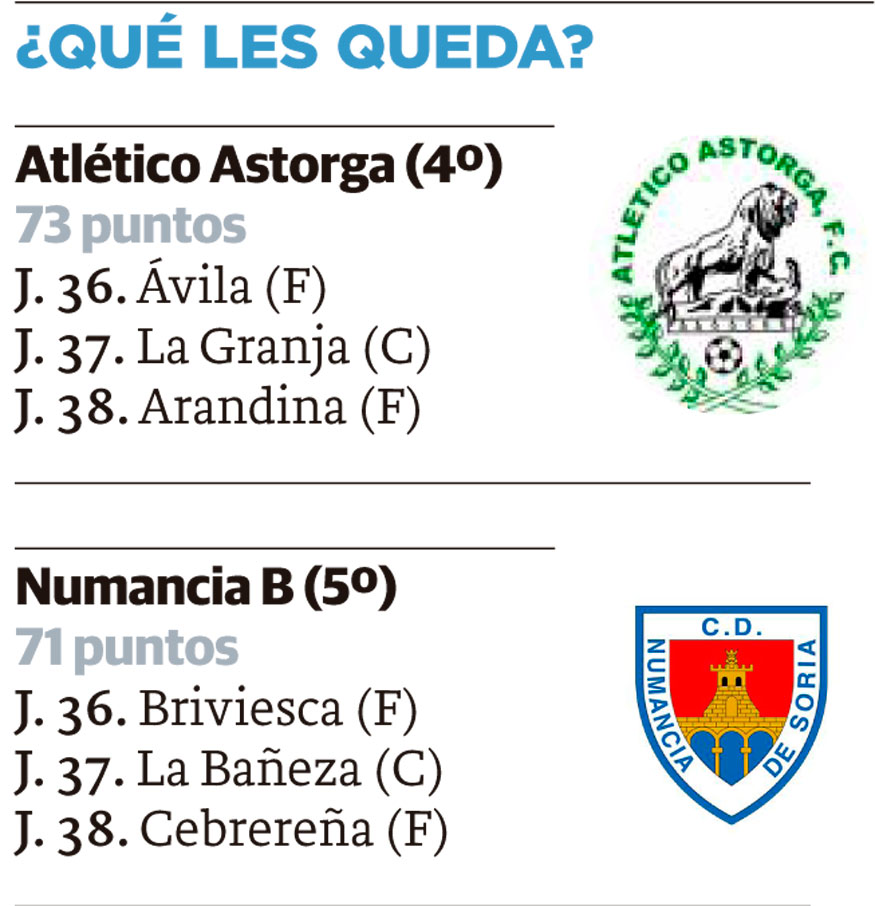 El Astorga debe afrontar dos partidos fuera de casa ante rivales muy complicados en los que no puede fallar, ya que el Numancia disputará sus tres partidos(también dos fuera de casa) ante equipos de la zona baja que, eso sí, se juegan la salvación como el Briviesca o la Cebrereña además de La Bañeza, ya con la permanencia asegurada, en su feudo.