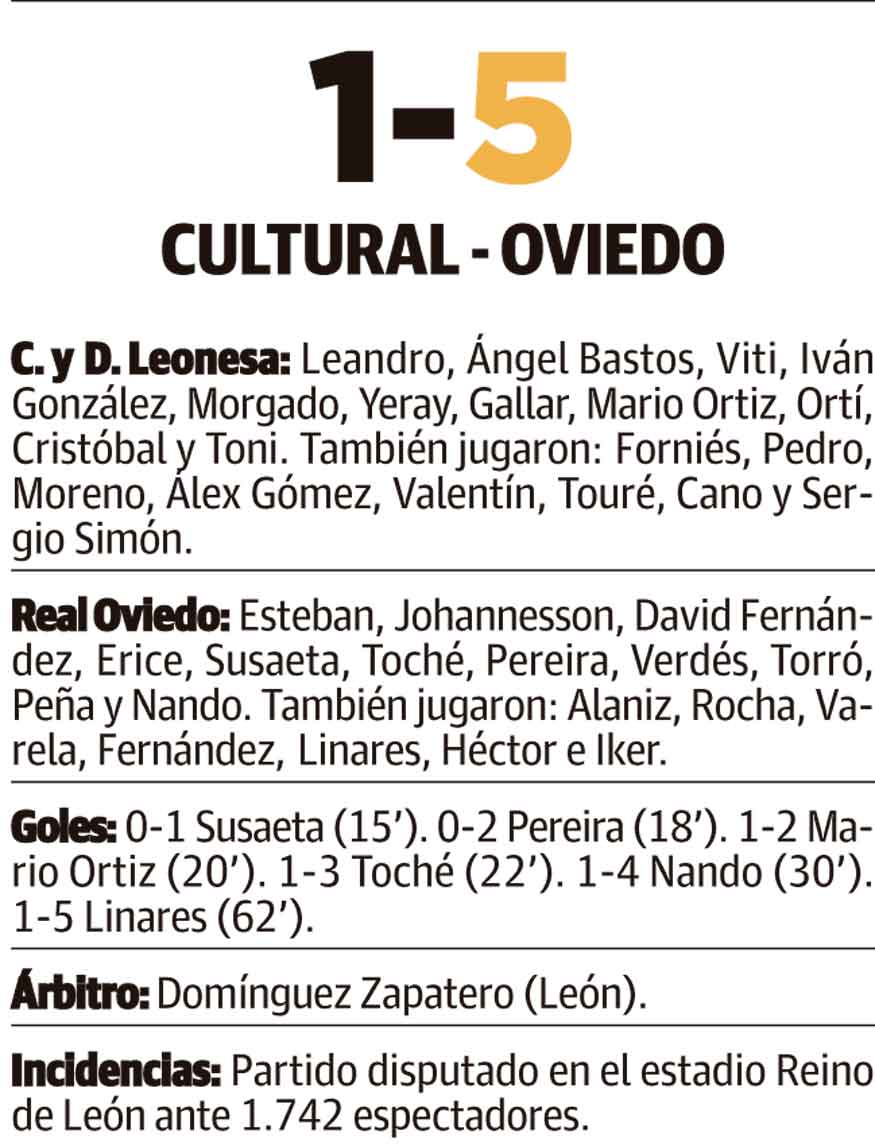 Jugar ante un rival de superior categoría en plena pretemporada es sin duda un arma de doble filo. Puede ser toda una fuente de ilusión si se consigue realizar una buena actuación, pero también todo un golpe de realidad queponga a cada equipo donde la lógica debe mandar. La Cultural ha vivido ambas situaciones en lo que va de verano, tras ganar al Mirandés y ahora, lamentablemente en el estreno ante la afición, tras recibir una goleada ante el Real Oviedo.El equipo leonés cayó con todo merecimiento ante un conjunto carbayón muy superior que se divirtió especialmente en la primera mitad con una endeble defensa culturalista en la que la mejor noticia fue sin duda el regreso a la portería de Leandro casi seis meses después de someterse a una operación en los ligamentos de su rodilla.