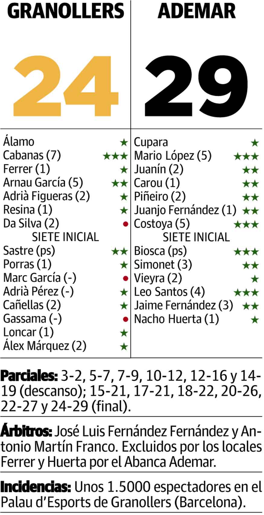 Los minutos pasaban y los errores favorecían mucho más a los visitantes que al Granollers, que nunca se acercó más de cuatro goles a los de Guijosa, coincidiendo además con la única exclusión en contra que sufrió el Ademar en todo el partido.