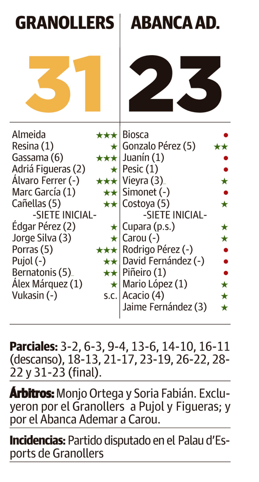 ¿La primera? Aún en la primera parte gracias a las acciones individuales de Acacio, que tras errar sus dos primeros tiros marcaba tres tantos seguidos para liderar un parcial de 1-5 que suponía el 14-11, si bien el Granollers volvía a ampliar hasta los cinco (16-11) para irse con mayor tranquilidad al descanso.